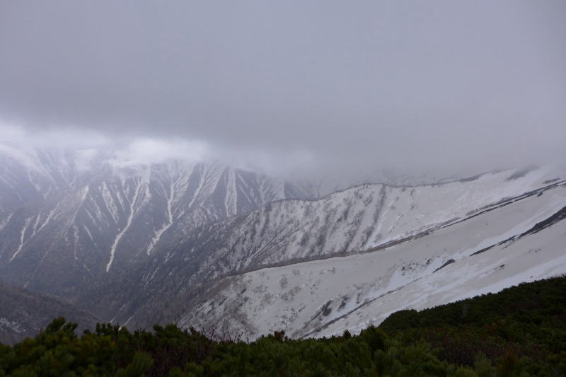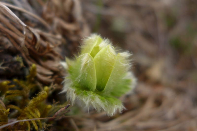 ピパイロ岳から北戸蔦別岳に向かった今朝がたに、ツクモグサの蕾をたくさん見た。ただ、太陽が登り切らない朝早くのことだったので、下山予定の明日(3日目)に花見をしようと考えていた。計画を変更し戻ってきた2日目の午前、ツクモグサの植生地に着く前に、日高の山は真っ黒な雲に覆われてしまい、太陽を見ることもなくなった。ということで最悪のコンディションの中、稜線を歩く。北戸蔦別岳への往路、1967峰でまだ芽を出していないツクモグサを2株見た。その場所は、八ヶ岳のツクモグサの植生を知っていれば探し当てられるところだった。まったく環境が似ている。強風下なのでその場所以外を探すことはできなかったが、当然ながらあるところにはあるはずだ。