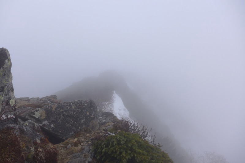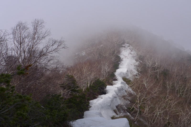 明るいうちに一気に下りるため、あまり立ち止まらなくていいようにピパイロ岳頂上の岩陰で身支度をしっかりと整える。まったくすごい風だ。濃いガスで視界も利かない。しかし、モチベーションは高い。ピパイロ岳から伏美岳まではアップダウンが多い。その上に夏道に残雪が覆っているところもある。取り敢えず、伏美岳まで登り返さないといけないが、ここが正念場であった。我慢に我慢を重ねて2時間、ただひたすら進む。頂上はまだあと一つピークを登ればいいのかなぁと思っていると、ヒョコッと伏美岳の肩に出てしまった。
