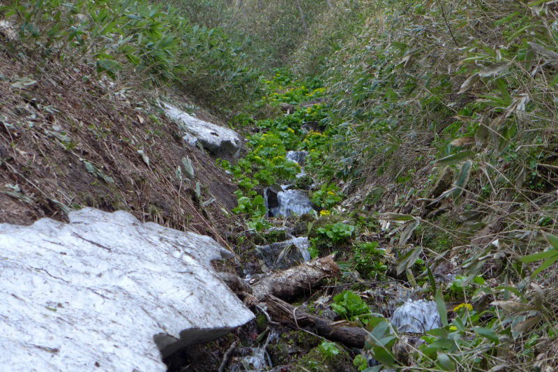 ここまできたら伏美岳の下山は朝飯前と思うのは早計である。1,792mの頂上から770mの小屋までの標高差は1,000mもある。雪の付いた斜面、雪が融けたドロドロの急な下りの登山道、その泥道で滑る。間もなく登山口という手前の沢で汚れを落とし、めでたく到着した登山口で下山時間を記入する。車が1台あって明日の登山のための車中泊のようだった。お声を掛けて、伏美岳避難小屋でご一緒することとなった。