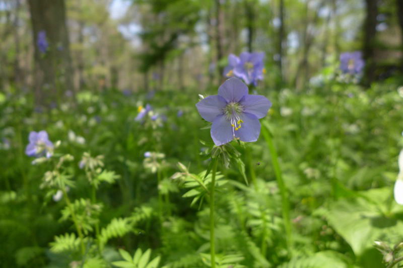 そのシラネアオイとオオバナノエンレイソウが咲いている場所と道路を一本隔てると、植生がほんのちょっと変わる。ミヤマハナシノブ(あるいはヒダカハナシノブ)が集まって咲いているところがあった。なんとも清楚で清々しい花なんだろう。ほとんどが蕾だった。