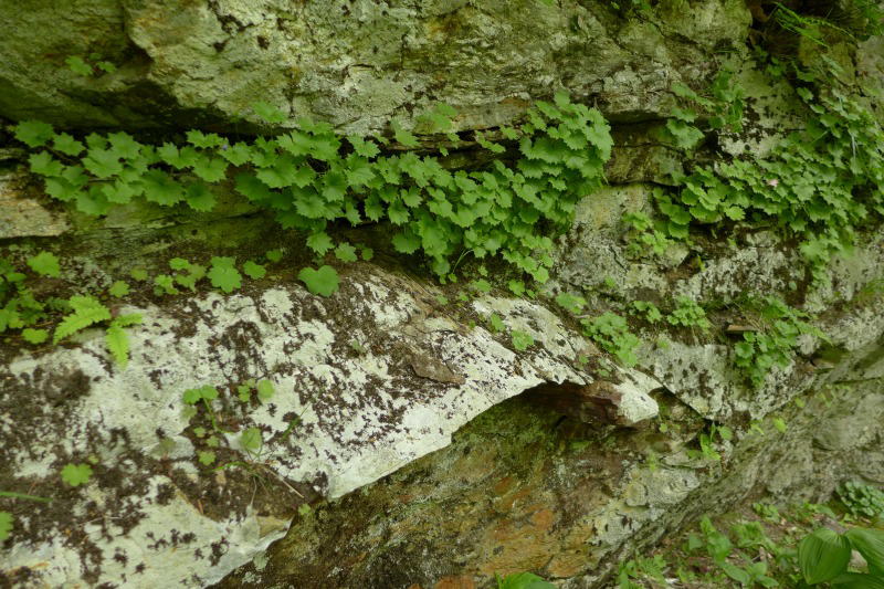 林道は途中で沢で分断されている。この沢を渡るには四駆でないとヤバい。レンタカーを傷付けてはいけないが、ここで車を置いて歩く時間的余裕もないので、ままよと車を沢に突っ込む。水かさが排気管まではなかったので無事渡り終え、少し行った先から歩く。ここはヒグマの巣である。よく町に出てきて駆除されている。だから人が入り込まないので、ヒダカイワザクラもわりと安閑としていられるのだ。そうでなければ、大ドッケのフクジュソウの二の舞になるだろう。今回は少し上流部まで足を伸ばした。ある一定の条件の露岩のところには必ずヒダカイワザクラが密生している。