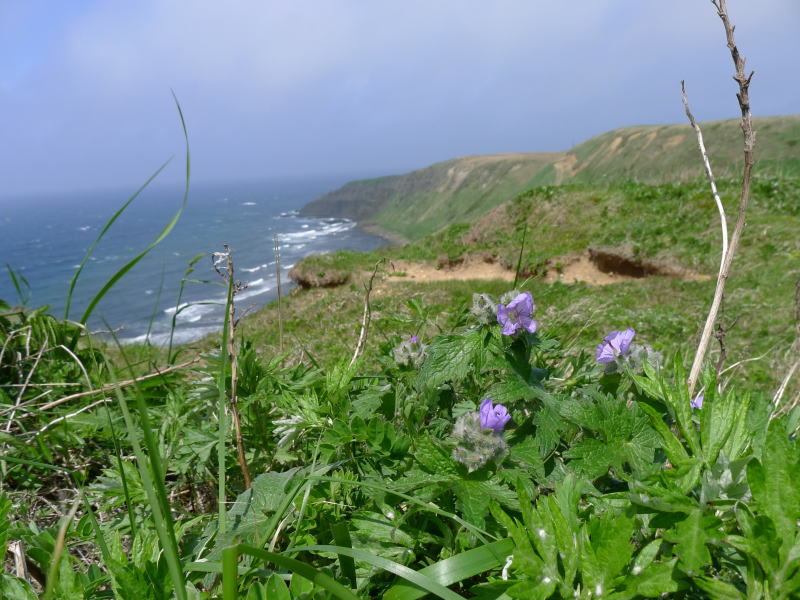 路線バスを香深からスコトン岬の手前にある江戸屋バス停から少し香深寄りの断崖で降り、レブンコザクラなどの花々を心行くまで堪能しました。しかし、ここは交通量の多い道路沿いで、バスや切る間から見た崖下に取り付く姿は奇妙に映ることでしょう。めげないで次の崖へ、また次の崖へと移っていきます。崖が切れると花もなくなりますので、スコトン岬へ向かいます。島の西側海岸が見えるようになると風がとても強く吹き付けてきます。