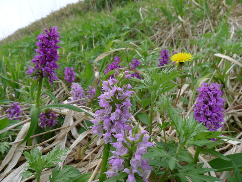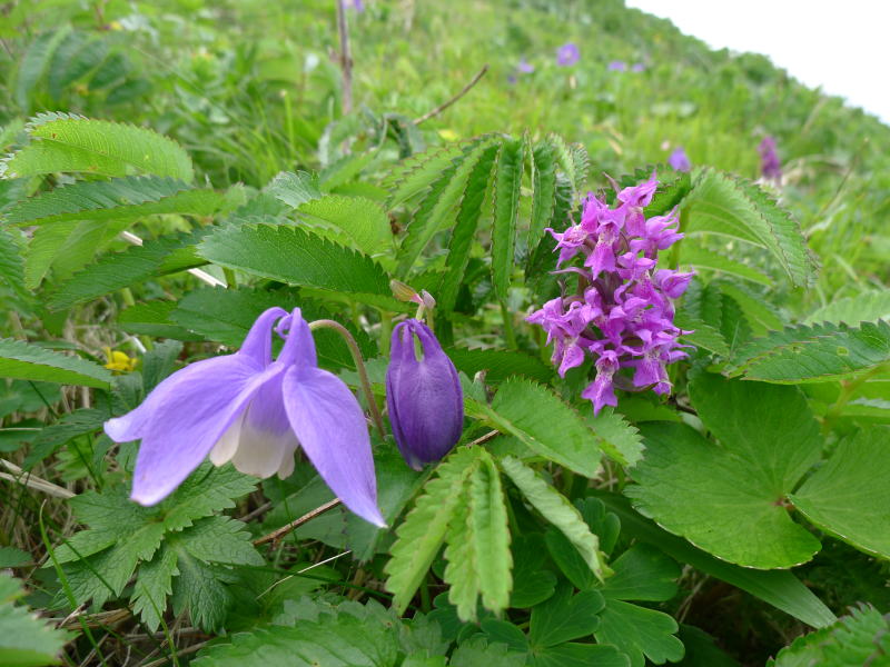 スコトン岬そのものに取り立てて興味は湧きませんので、4時間コース・8時間コースに取り付きます。いやはや、それにしても色鮮やかなハクサンチドリのオンパレードです。ミヤマオダマキも負けてはおられないと言いうところですが多勢に無勢です。実はハクサンチドリは道路の崩壊した斜面に多く咲いています。普通、野の花は昔からの表土が削り取られたようなとこにはあまり咲かないものです。しかしこのハクサンチドリは礼文島でこの世の春を謳歌しているようです。