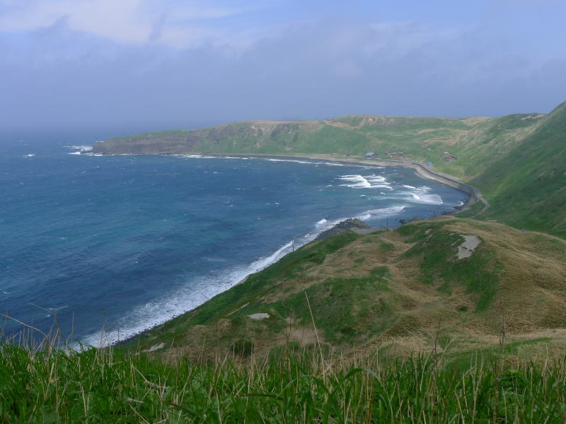 このルートにあるのはチシマフウロと、ゴロタ山で見かけたエゾイヌナズナだけです。ただ早くこの場所を去りたいだけの一心で歩きます。そして海岸へ下りる長い木道階段を下りると不思議なことに風がそれほどでもないのです。廃屋となった家々を過ぎて鉄府の集落から舗装道路に上がります。