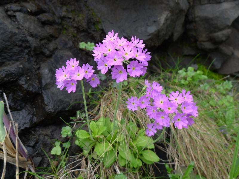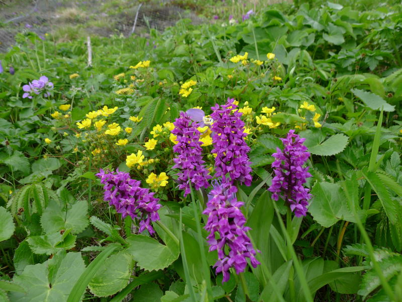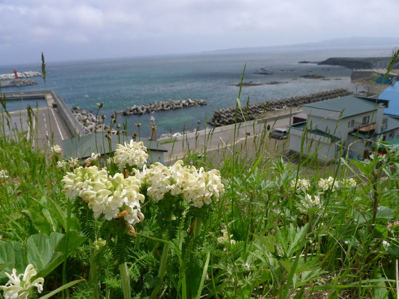 そういう意図で山側ばかりを見ていると、あそこにもここにも花が咲いています。民家の庭にはオダマキやリシリヒナゲシが咲いています。リシリヒナゲシは苗から植えたものでしょうが、砂利敷きの庭一杯に咲いています。オダマキも園芸種かもしれませんが、それでも離島の風情に似合っています。バスが進んでいくとキジムシロ、レブンコザクラ、エゾカンゾウ、ミヤマアズマギクと思われる青い花、ウルップソウに似た花、ヨツバシオガマ、ネムロシオガマ、イワベンケイ、ハクサンチドリなどが走行中のバスの窓から見ることができます。
