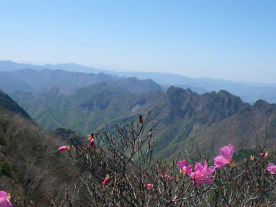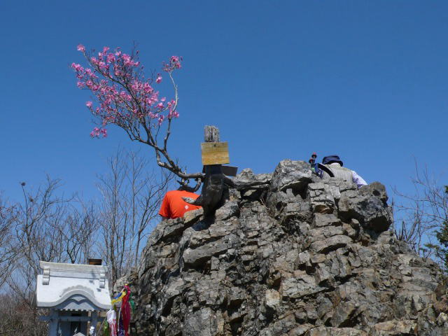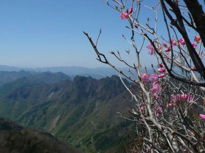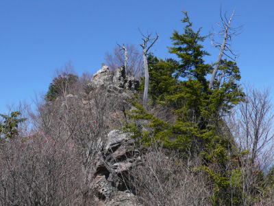 弘法の井戸で清水を飲んだ後、程なくして清滝小屋に着く。小屋裏を登ると程なくして産泰尾根に取り付き、七滝沢コースとの分岐に出合う。ここからはわりと平坦で快適な尾根道となって、最後にひと登りすると両神神社に出る。さらに進んで露岩を登り詰めると両神山の頂上にぽっと出て、不思議なヤシオツツジが迎えてくれるのである。頂上からの眺めは360度広がっていて、武甲山が間近に見えるし、雲取山や甲武信岳だろうか、山ひだに雪を抱いて聳えている。