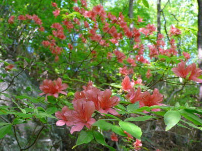 新緑は、どの山で見ても清清しいのだろうが、分岐の「会所」から「弘法の井戸」までの沢筋の新緑の美しさは際立っている。特に今日6日は、早朝に強風が吹いて快晴となったことから、空の青さも関係しているのだろうが、まったく疲れを感じさせない心地よさである。また、山肌をこれでもかと覆うニリンソウの大群落も驚きの一つである。日高の井寒台森林公園のニリンソウも、シラネアオイやエゾオオサクラソウ、カタクリ、エゾエンゴサクなどを従えて遊歩道を埋め尽くしていたが、ここ両神山のニリンソウの規模は物がまったく違う。ただ、残念なことは、ピンクのテープがこれでもかというほど木々の枝にくくりつけられていることである。日本百名山の両神山でも最も一般的なコースで、迷うことが難しいほど踏む付けられた登山道に、整備された標識があるにもかかわらず、ヒラヒラ、ヒラヒラ、ヒラヒラと100mも行かないうちに次のテープが現れる、よくもここまで付けることができたなというほどに。新緑の木々の間から見えるのはツツジのピンクの花びらだけで十分なんだが・・・。