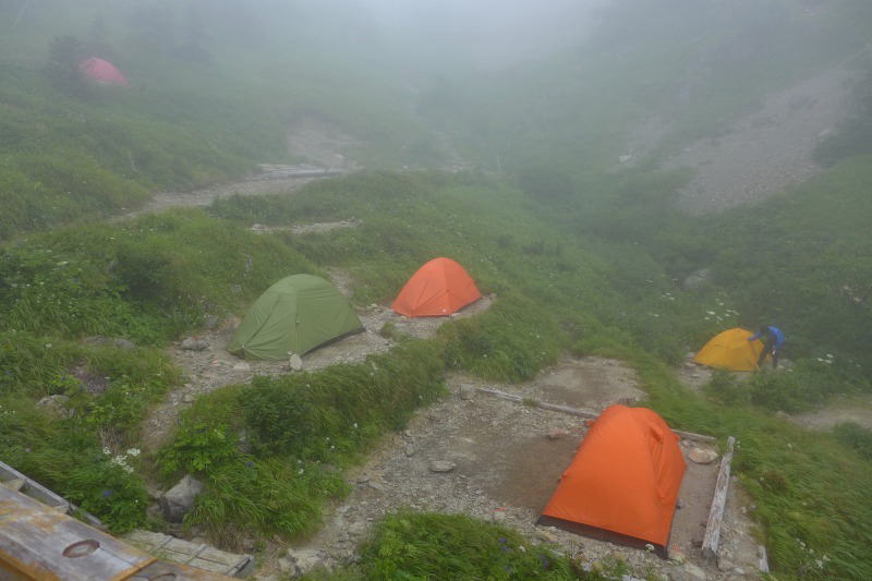そのような人のことを言っていてもしようがない。携帯で雨雲の現在位置を見ると、茶臼岳に次の強い雨雲が迫っている。ただ、日本海から長い帯になっている雨雲は徐々に南下しているようだ。それに追われるように下山を急げば雨に打たれないだろうと、テント内であらかたパッキングして最後にテントを畳み、雨をたっぷり吸いこんだテントやフライシートをザックに収める。朝食はなし。とにかく小康状態のうちに高度を下げるに限る。