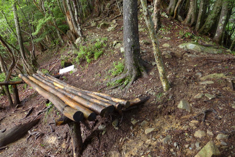 雨ですっかり洗われて滑りやすい登山道を下る。途中歩きながら小腹を満たし横窪沢小屋に着くと、ちびっこ登山家たちが出発の準備をしている。ここでまた、登山家たちと戯れて25分も遊んでしまった。ちびっこ登山家たちは小屋を出立し、ひらりひらりと登山道を下りて行く。途中すれ違う登りの人たちが目を丸くしてちびっこ登山者が下りて行くのを眺めている。「すごいですね〜。ザックが体にぴったり馴染んでいますよ。」と話しかけてくる人もいる。ザレた急斜面の下降を見るととんでもないちびっこ登山家であることを認識する。