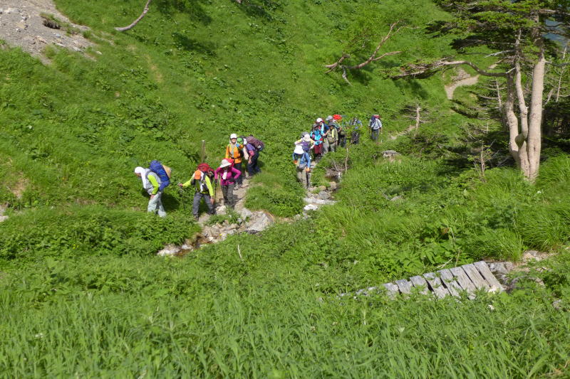 のんびり長い距離を歩くことができる山ということで、南アルプスを2013年の夏山第一弾として選んだ。コースは、茶臼岳〜聖岳〜赤石岳〜前岳〜中岳〜悪沢岳〜千枚岳を周遊するもので、基本はテント泊である。ただし、東海フォレストのバスを使う都合上、どこかで小屋に1泊しなければならないことから、取り敢えず夕飯のトンカツのおいしいと評判の百闢エ山の家を3泊目に利用する計画とした。(※ テント:アライ エアライズ2、グランドシート、チタンペグ ザック:OSPREY CRESCENT 50)