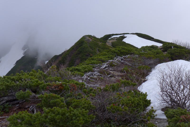 仙丈ヶ岳から小仙丈ヶ岳方向に進んで仙丈小屋に行くルートは、小屋の人が入っているだろうから雪渓があればベンガラでも撒かれているだろうし、頂上で聞いた作業の音はスコップで雪渓を切っているようなものでもあったし、さらに明日の開業を控えてそのような作業は準備万端だろうと、安全策を採って遠回りして小屋へ行くことにした。1か所だけナイフリッジ状となった尾根に積もった雪の上を行くほかは、夏道が出ていた。分岐からもしばらくは夏道で小屋の手前で雪渓の斜面を下るところがあったが、なんら問題となるものではなかった。雪の上には2人分の明瞭な足跡があった。