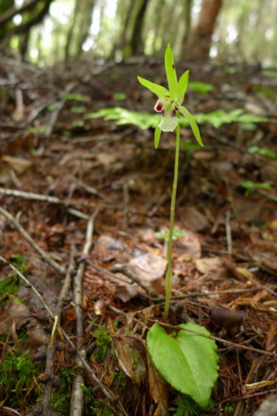 樹林帯の中の登山道は、孝行の猿の碑があるところをさらに進んで自然林の中に付けられている。腐葉土がたっぷり堆積した土壌のところでは、ラン科の植物のお出ましが期待された。その期待にそぐわず開花したイチヨウラン1株とまだ蕾のキソチドリを複数見ることができた。イチヨウランの葉と違って縮緬のような感じで色の濃いラン科の植物は、目を皿にして見ても見ることはなかった。苔むした深い森を歩いていると登山道にカメラの一脚が落ちていた。ラベルテープに「KAZUYA」という名前が書かれていた。すぐさま、この一脚の落とし主は新井和也さんに違いないと思った。新井さんは2013年、剣岳で落石事故に遭い命を落としている。(新井さんのホームページとブログ「KAZの活動日誌」へ)