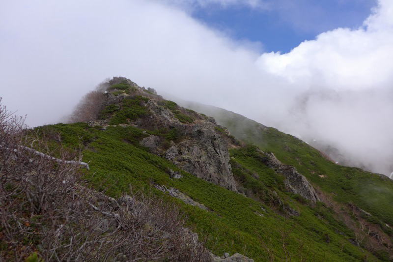 右側の雲の中に茫洋と大仙丈ヶ岳が浮かぶ