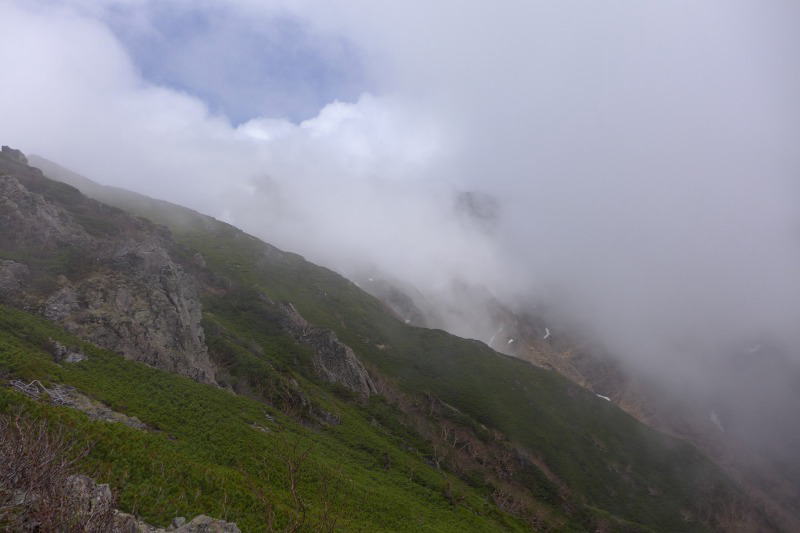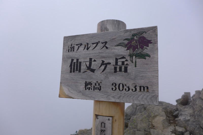 標高を上げるにつれ雪が徐々に出てくる。森林帯からハイマツ帯へと森林限界に入ると雪渓がしっかりと残っている。風が吹き付けてきてガスが濃くなる。仙丈小屋(丹渓新道への)分岐はまだかなと思って露岩を登って行くと登山道に階段が付けられ整備されている。おかしいなぁ、地蔵尾根がこんなに整備されているはずはないと思う間もなく仙丈ヶ岳の頂上標識の裏にポッと出た。登山口を出発して7時間30分ほど経過したときであった。
