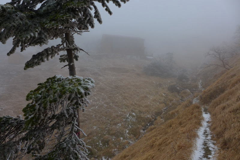 横窪沢小屋(11:00)の冬季小屋をお借りし大休止後、明るい樹相ながら急登が始まる斜面を黙々と登る。中の段、ベンチ、樺段と無難なく歩き、水平道に至るころにガスが濃く立ち込めるようになった。茶臼小屋が見えてきたが、その先の視界はない。そのような天候は、ヤマテンから配信されてきていたが、取り敢えず無事に小屋に到着したことをもってよしとし、光岳へ向かう気力と体力は少しも残っていない。酒、夕食の後ただちに入眠する。