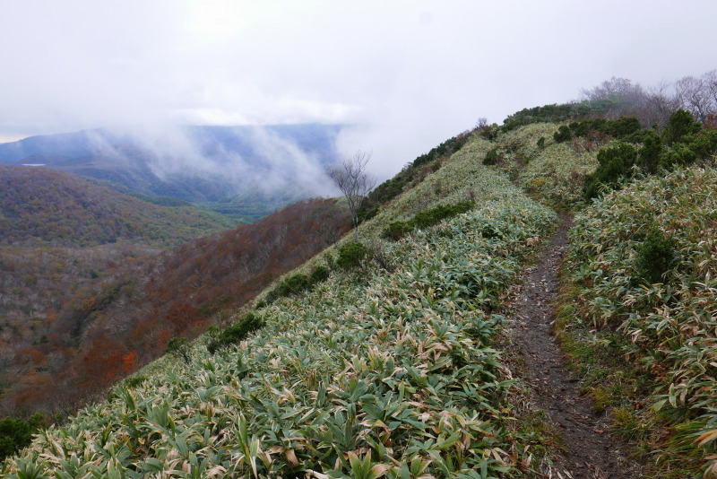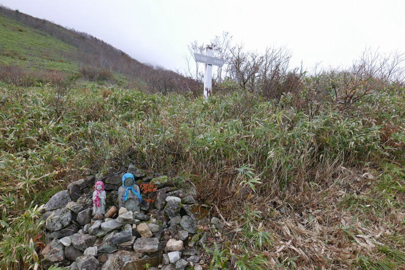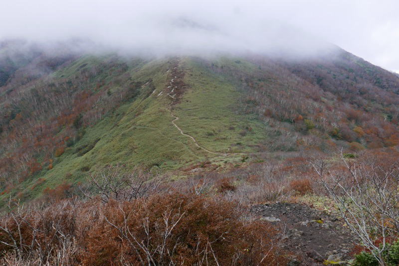 朝日岳の肩から朝日岳頂上までは5分の道のりだが、展望もないだろうし面倒なのでそのまま北上し、滑りやすい泥道を歩いて清水平を過ぎ、熊見曽分岐を経て北温泉分岐に着く。地図上では登山口である駐車場か北温泉分岐まで3時間程度の行程なのだが、もたもたと歩いていたからもう少しかかっていただろうか。分岐のベンチで休んでいた栃木県内のお2人とあれこれ話をしながらお腹を満たし三本槍岳に向かう。三本槍岳は「岳」という名前が付いているのでさぞかし険しい山と思いきや北温泉分岐の標高(1,856m)から61m高いだけの1,917mであり、体に優しい歩きをさせてくれる。