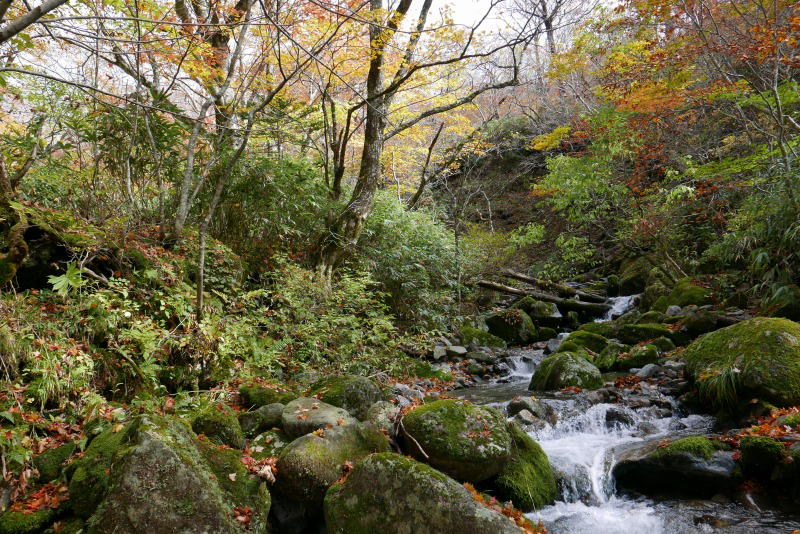 大峠から三斗小屋温泉までの間に3本の沢があるが、どれも渓相はよく終盤の紅葉飾られている。雰囲気が明るくなって道もよく、やっと愉快な山歩きが始まった感じとなる。ゆっくりと山の空気を吸いながら歩きたいところだが、もたもたしていると露天風呂が15時から17時の女性の時間となってしまう。その前に温泉に入ってすっきりし、着替えてからゆっくりと待ちに待ったお酒タイムとしたい。