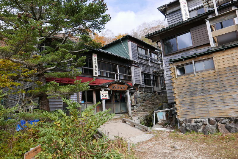 その後も紅葉のプロムナードは続くが、その先に三斗小屋温泉の建物が見え隠れする。煙草屋旅館で受付を済ませ、ザックを置いてテントを張る場所をキープするだけにし、すぐさまさっそく露天風呂に入ることにする。15時までは混浴であるものの白昼の露天風呂に入る女性は(この日は)いない。大雪山の旭岳から中岳に向かうと温泉が湧き出ているところ(中岳温泉)があって、寝そべるようにして温泉に浸かることができる。だれも来ない早い時間に入ろうと白雲岳のキャンプ場を早めに出て温泉に入っていると女性が二人来て、「私たちが入るから出てよ。」と言われたことがあった。大自然の中の露天風呂であり山中のことだから誰も管理しているところではないが、その勢いに従うしかなかった。