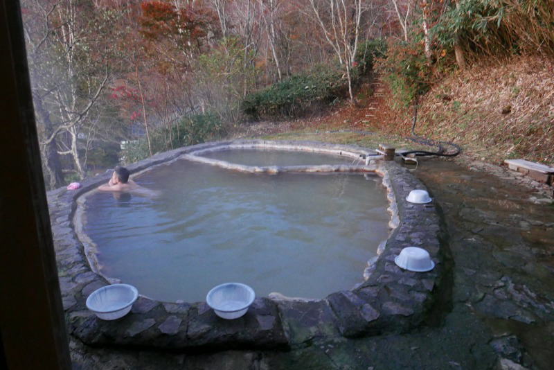 露天風呂は15時からが女性の時間で残り時間あと30分なのでテントの設営は後からと急いで向かう。数人の男性が湯船に浸かっている。小雨に降られて約6時間の道中で疲れた体を湯船に沈めると、もうすべてが平和に感じられる。あ〜、遠回りしてよかった、テントを担いで苦労してよかった〜。