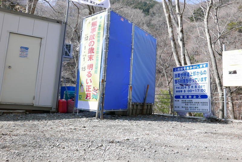 後山林道を片倉橋ゲートまで進みゲート前に車を停める。平日なので車もなし、人の気配もない。まあまあの重さとなったザックを担いで林道を進む。途中で林道斜面の工事が行われていて警備員も配置されている。その先を進むと工事事務所があり、脇に囲いで目隠しされた簡易トイレが置かれていて、「登山者も自由に使ってください。」「衛星携帯電話を用意してあるので必要なときは使えます」との案内が書かれている。そこまでの念入りな安全対策、便宜の用意が警備員の配置につながっているのだなと感心する。工事会社は山梨県の深沢工業所である。