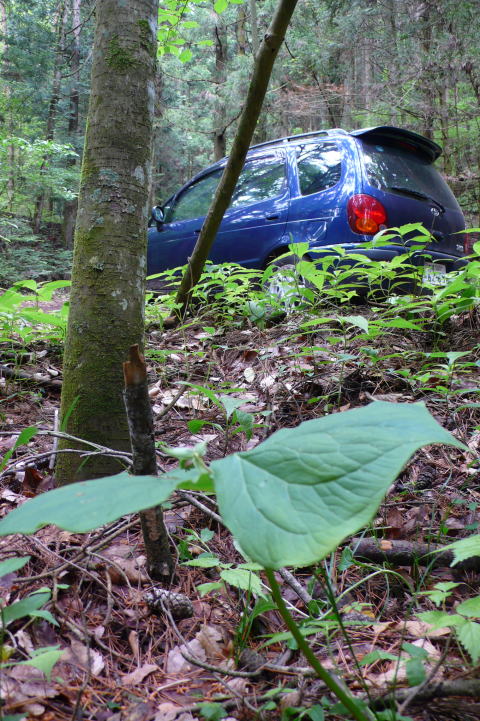 コアツモリソウが咲くという杓子山付近の山を登ろうと東富士五胡有料道路を山中湖ICで下り、忍野村内野から二十曲峠へと向かう。方向感覚が狂って峠を過ぎ鹿留(ししどめ)林道を都留市方向にしばらく下ってしまう。峠に出る前に林道から杉林をよじ登って加瀬山に出るのがコアツモリソウとの対面のチャンスと車を林道沿いに停める。