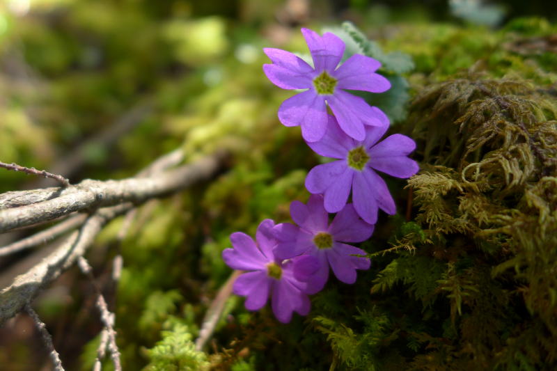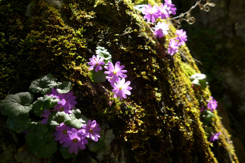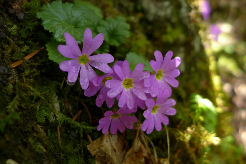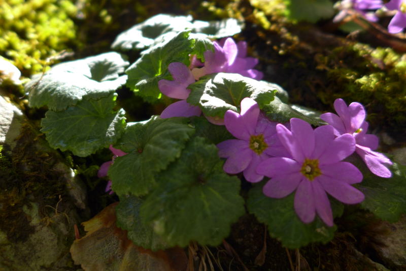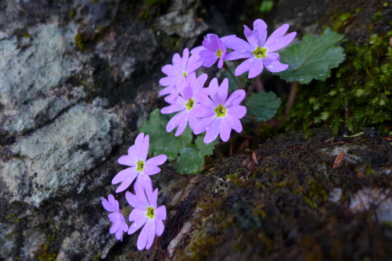 手付かずの苔むした岩場でシナノコザクラが群れる