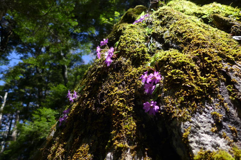早朝のシナノコザクラとの初めての出会いから4時間が過ぎた。ふたたびその場に戻ると初夏の光を浴びた花たちは輝いていた
