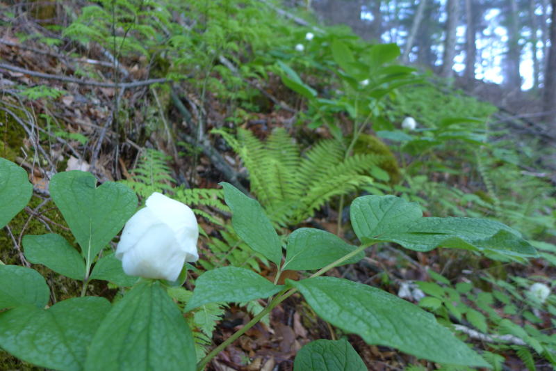 淡々と展望も利かない日の射し込まない樹林の中の道を標高を上げて進む。樹林下の植生の変化を気にしながら歩く。気を付けて見ると、岩屑が堆積したところに綿帽子を被った貴婦人がいる。愛しい貴婦人であるヤマシャクヤクが、蕾を閉じたまま10株ほどあって、未開花株となると数えきれない。いかんせん、樹林帯に陽が射しこまない早朝のことなので、ヤマシャクヤクは花弁を広げることなく佇んでおり、下山時に再び訪れることとして登山を続行する。