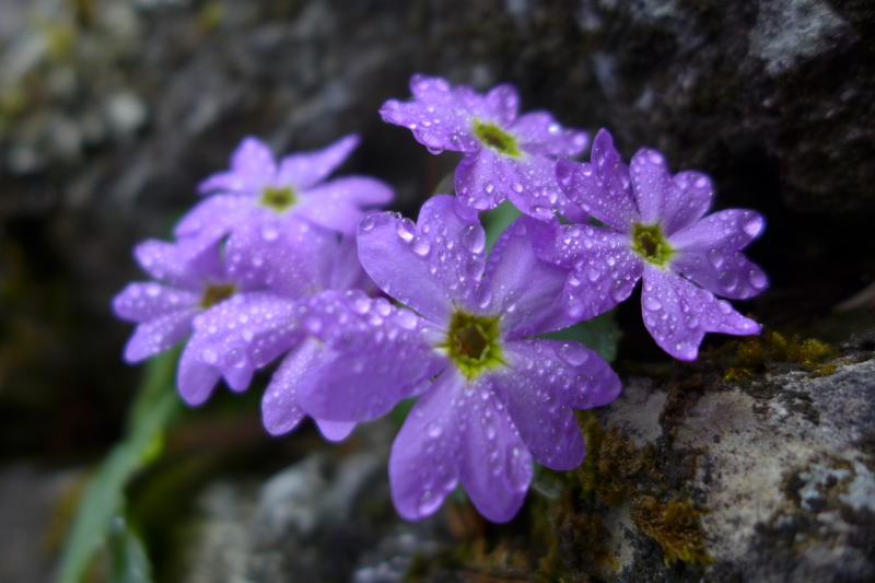 さらに進むとシナノコザクラが群れている。しかしここも、まだ陽の射さない早朝の時間帯なので、花にレンズを向けても発色がよくなく、下山時に見せてもらうことにし、先にへと急ぐことにする。少し標高を上げたところで岩場を登るが、ルート取りを考えながら登ったものの、道を見失ってしまった。そのうちに元に復して陽の光が差し込むいい雰囲気の針葉樹林帯の中を登る。好ましい雰囲気のところであった。
