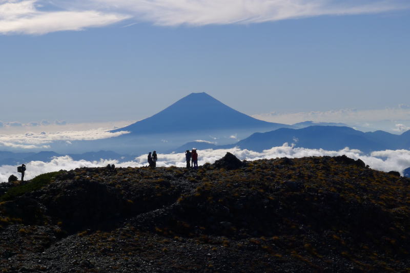 今どき、白峰三山で(熊)鈴をガシャガシャ鳴らして歩く者はいないだろうと思われるかもしれませんが、そうでもありません。快晴の大展望を堪能しながら中白根山に向かっていると、おじさんが北海道で使うような熊鈴を鳴らしながら登ってきます。おじさんは明るく「おはようございます。」とあいさつしてくれます。清々しい朝のあいさつですが、「おじさん、熊はいないよ!」と教えてあげたのでした。余分なことですが・・・。