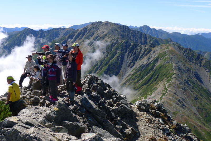 昨夜の熊ノ平小屋の宿泊者は1人のようでした。主稜線を外れるとそれほど閑散としているということの証なのですが、間ノ岳の頂上に出ると、まだ午前8時だというのにその人の多さに驚くと同時に、この先北岳への稜線での人との擦れ違いに鬱陶しい思いです。昨日歩いた塩見岳への稜線や農鳥岳に別れを告げて足早に間ノ岳の頂上を去ります。大きな団体も含めどんどん登ってくるので、岩場の狭い登山道で待つことが多くなります。