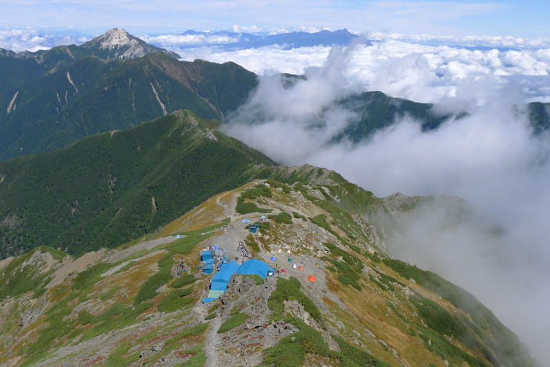 いつまでも眺めていたい北岳山頂からの眺望ですが、次々に人が登ってきておちおちしていられません。デジカメのムービー機能で360度の眺めを写して下山を開始し肩ノ小屋に向かいます。肩ノ小屋はテント場からの眺めがよく、お気に入りの場所です。リフレッシュのためにコーラを買い求め、ついでに小屋の青年に大樺沢の様子を聞くと、台風12号の大雨で橋が流されて通行不能とのことでした。ということは、草スベリと白根御池小屋からの急斜面を転げ落ちなければなりません。困ったことになってしまいました。