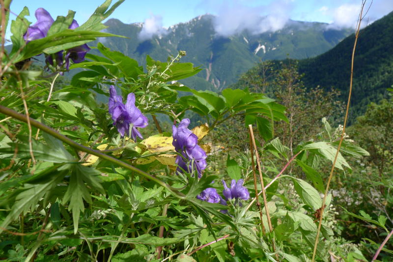 それに最終バスの発車時刻も心配です。肩ノ小屋から広河原までの地図上の所要時間は4時間ほどです。計画書には最終バスに間に合わないようなときは肩ノ小屋か白根御池小屋でテント泊することとしていましたので、間に合ってもよし間に合わなくてもよしの余裕がありました。その精神的ゆとりからでしょうか。縦走装備が入った75リットルのザックを担いで小太郎尾根へ、小太郎尾根から御池小屋までを疾風のごとく駆け下ります。まだ12時前ですから登ってくる人が大勢いますが、多くの人が休みながら登ってきて道を開けてくれます。下る人も次々と道を譲ってくれますので、標高差800mはあっという間でした。と言っても1時間5分はかかってはいますが。