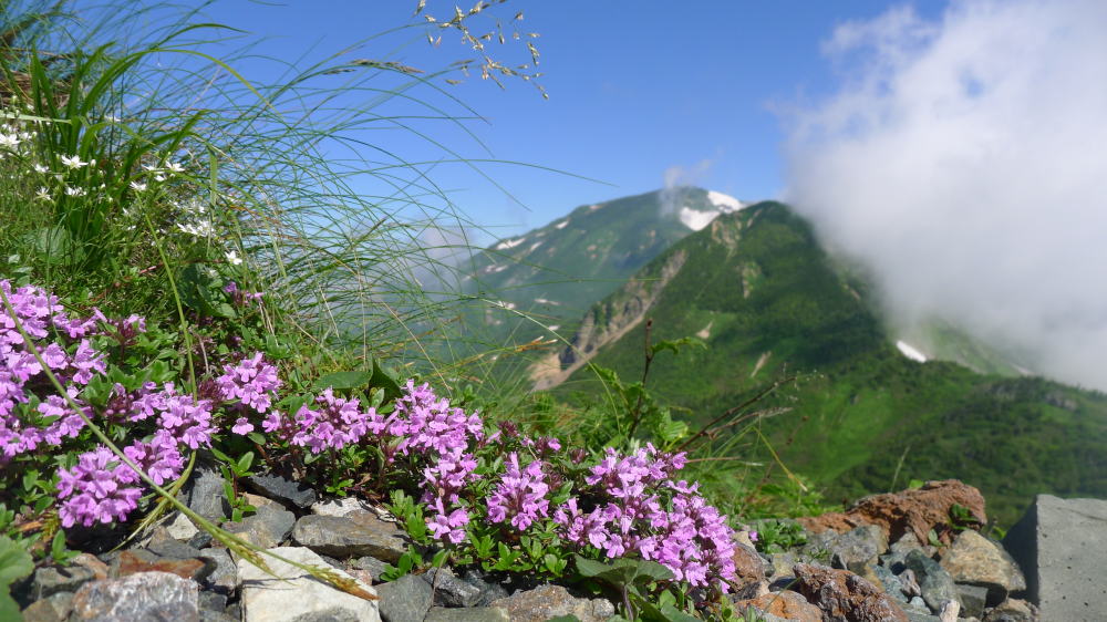 イブキジャコウソウ (鉢ヶ岳と奥に雪倉岳)