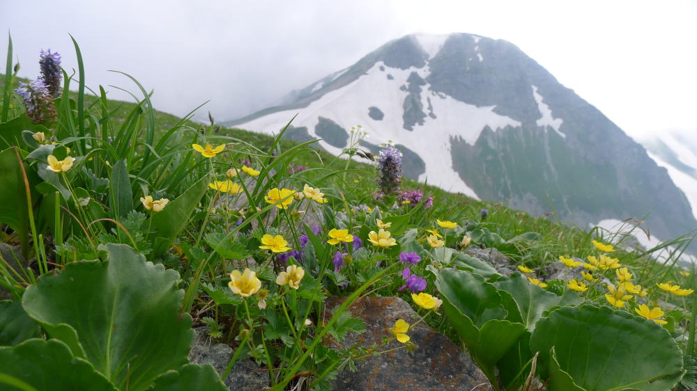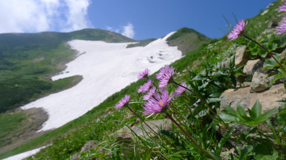雪倉岳で小休止の後、下りにかかる。ここでのお目当ての一つはツクモグサだ。これまで何度かツクモグサを見に北海道日高山脈のピパイロ岳に登った。そこは残雪と新緑をまとった幌尻岳、戸蔦別岳などの日高の山々の絶景ポイントでもあるが、ピパイロ岳の先の稜線に咲くツクモグサは素晴らしいの一語に尽きる。そんな北の山のツクモグサを見ていることから白馬岳、雪倉岳のツクモグサは、八ヶ岳のツクモグサのようなおおらかさのない、ちんまりとしたものだろうとの先入観は見事に覆されたのだった。