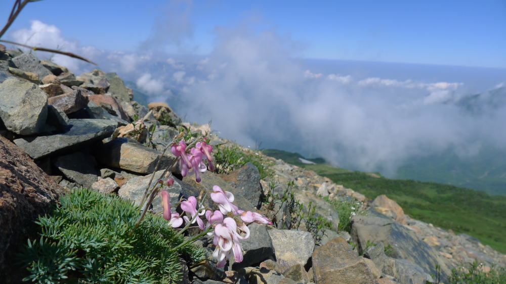 三国境から白馬岳に向かうようになると人が多くなる。「白馬」と言う名前は何か優しさを感じさせるが、その名前に反して頂上への最後の登りはなかなかのものだ。それでもコマクサが、続いて旭岳を背にウルップソウ、ハクサンイチゲ、ヨツバシオガマ、ミヤマエンドウ、ミヤマキンバイなどが咲くお花畑が延々と続く。