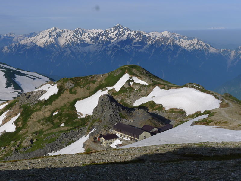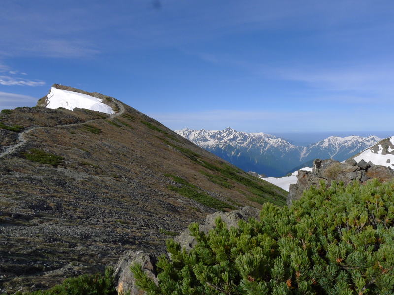 かけてです。白馬山頂をやり過ごし、雪渓に乗って進むと東斜面のザレ場に、