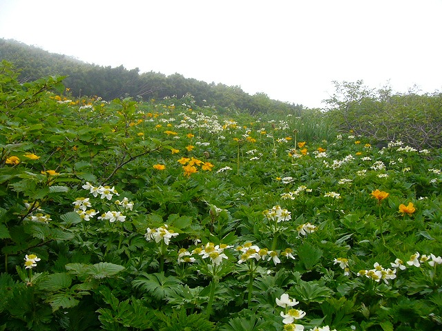 大地に合わせ背丈の高いエゾノハクサンイチゲとシナノキンバイ