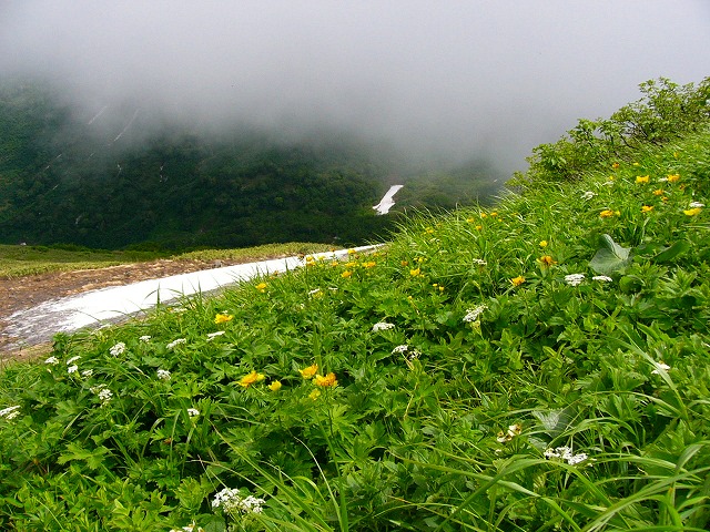 このお花畑からは急な登りとなるが,暑寒コース分岐までは雪渓が多く残っており,雪渓の上部一帯はお花畑となって,お花畑の中の登山道を延々と登って行く。すでに花の盛りは過ぎたとはいえ,それでも暑寒別岳箸別ルートのお花畑には,多種多様な花が咲いていて,まさに別天地である。是非とも花の盛りの時期に,じっくり登ってみたい山である。