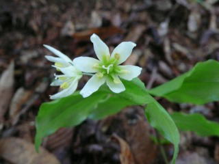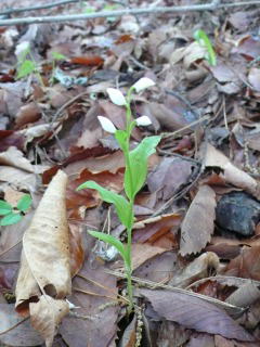藤子沢神社から植林された斜面を登り稜線に出合うと滝子山頂上までは自然林が続く。麓では花を咲かせていたチゴユリがまだ蕾のままで、ユキザサも花にはまだ早い。何かほかに花はないかと目を配って歩くと木の下の暗いところにユウシュンランが咲いている。始めてみる花である。結局この日ユウシュウランを見たのはこの1本だけであったが、絶滅危惧種に指定されているとあって、さもありなんと思ったのであった。