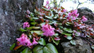 殿平で朝食を摂って、さあ出発しようと立ち上がると、腰の左側に強い痛みを覚えた。最近の気温の急激な低下でひいた風邪がやっと治りかけたばかりで体調があまりよくない。でも、ヤマシャクヤクに逢うためには先に進まなければならないのに、岩場で右膝を打ち怪我をしてしまう。さいさきがよくないなと思いつつ、核心の鉄塔付近からは目を皿にして四囲を窺うが、それと思われる葉や白い花はまったく見当たらない。そのうち登山道が笹で覆われてしまうので、もう植生の場所ではない。あきらめてミツバツツジを眺めながらヒメイワカガミの花の咲く次の場所へと向かう。ヒメイワカガミは、南面上部でわずかに開花していたが、頂上に向かう東面の登山道脇のものはまだ蕾のままのものが多い。