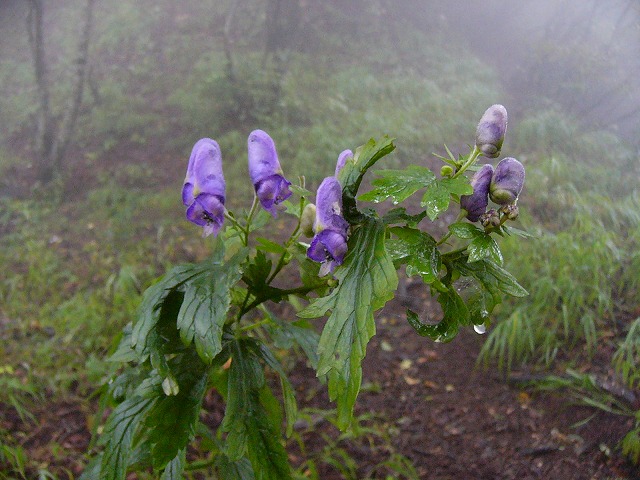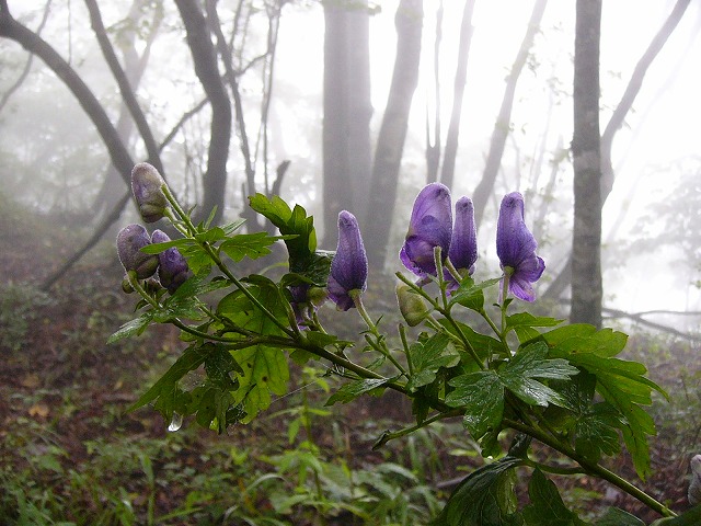 浜立尾根分岐を右に折れてアップダウンを繰り返し、最後のコルに下りると霧の中にヤマトリカブトが見える。わずか数本のトリカブトだが、思ってもいなかった花との出会いで心が弾んでくる。