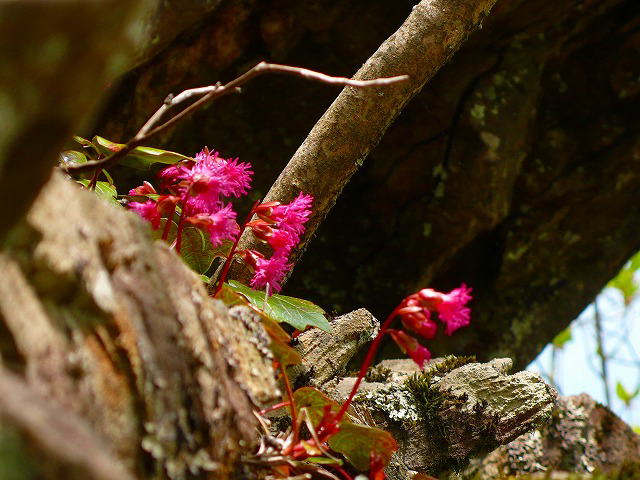 滝子山の頂上に着くと,合せて10人ほどの人がいて賑やかしいが,いつもの頂上で新緑に囲まれながらのんびりとした時間を過ごす。南稜に道をとって,秋にはヤマトリカブトが咲くコルを過ぎ,リンドウが咲く急な道をいったん下ると程なく1500mの岩場に出る。断続的に100m以上続く岩場にイワカガミがあるが,東稜と同じくほとんどが蕾の状態であった。