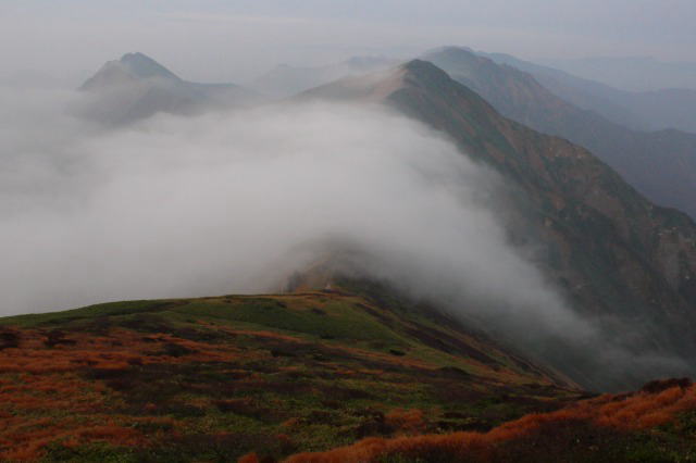 中ゴー尾根から流れる雲海(肩ノ小屋から)