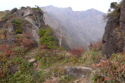 食事を済ませて外に出ると、稜線を越えてガスが万太郎谷に落ちている。西黒尾根方向も靄がかかっている。ザンゲ岩、ラクダのコブを経て巌剛新道分岐を分けず進む。岩場、鎖場の連続を淡々と下るとマチゲ沢と谷川岳をのぞくことができるビューポイントに達する。ここは2001年7月に登ってきた際、暑さのあまりバテバテとなって休憩を長く取った場所だ。