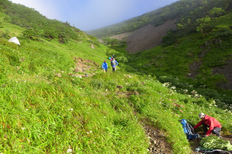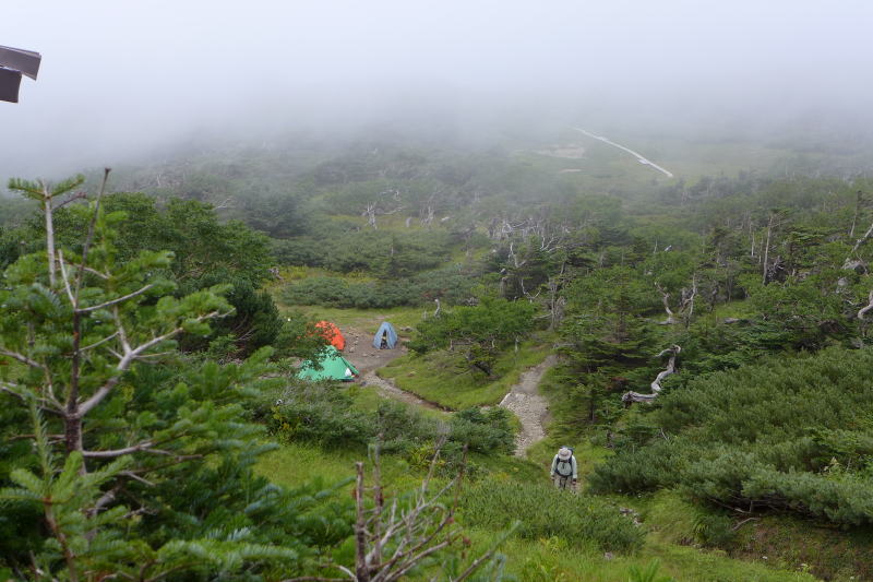 隣にMSRのテントを張った人は早々にテント場を発つ。茶臼岳稜線に出る人もそこそこいて、その背中を朝日が射すようになった。テントを畳んで稜線に向かうおうとするころになって、全体が急に濃いガスに覆われる。稜線のほうから2人が下りてくる。「稜線に出るまでが大変でした。強い風が吹き付けており、何かあったらと思って茶臼岳に登るのをやめて、これから下山するところです。」と言う。昨年2014年11月14日〜16日の日程で初冬の光岳を楽しもうと稜線に出ようとした。しかし、稜線にあと20mもないというところで強風に阻まれて先に進むことができなかった。茶臼岳への鞍部の強風は夏でも冬でもとんでもなく強いことがあるのだろう。