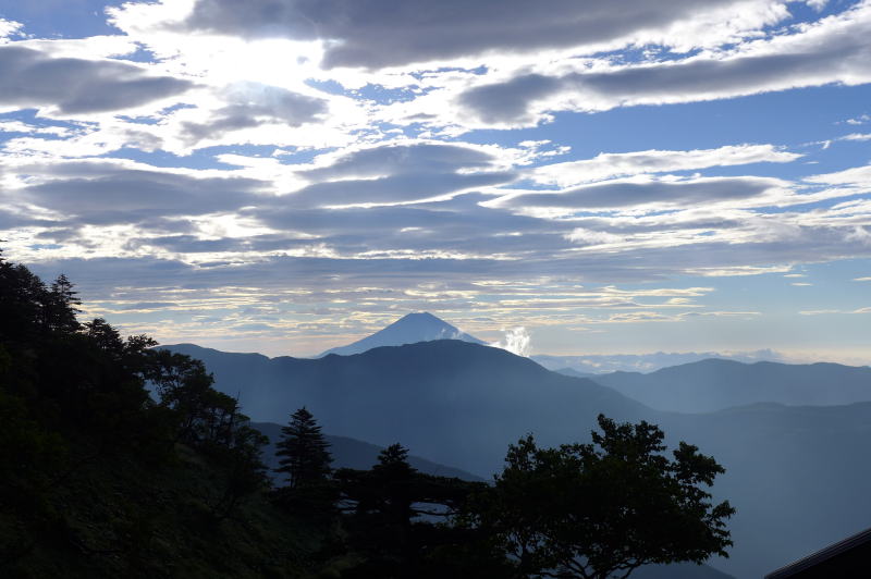 1日目の疲れはほとんど取れた。早く目を覚めたので換気口から外を見てみると濃霧である。前室に置いた登山靴はしっとりしている。もう少し様子を見ることにする。ただ、3日目の明日の予報は晴れマークだったので、今日は天候が悪くても光岳へは行くのだ、と固い決意である。テントの外が少し明るさを見せてきたので出てみると、富士山が顔を出している。ただ、かさ雲がかかっていて、早朝から湧き上がっている雲もあって、不順な天候を予想させる。