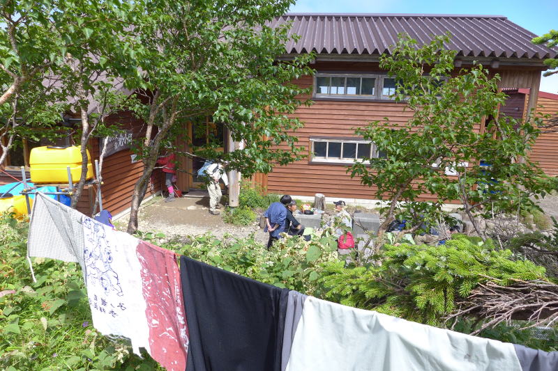 光小屋前テント場で登山者が衣類を干す