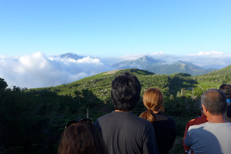 午後の早いうちから小屋前のベンチで酒を飲み、他の人たちと山の話に花を咲かせる。北アルプスを予定していたが予報が悪く、唯一ここが何とかなりそうだったから来たという人も少なくなかった。本当はジャンダルム〜槍ヶ岳の予定だったが、岩場が乾いているとき以外は入りたくないので、光岳にして大正解だった。稜線に多くの人が出て歓声を上げているので行ってみるともうガスに隠れようとする聖岳がでっかく見えている。その光景から離れることができないといった風情で、いつまでの遠くの山を見ているのであった。