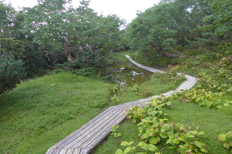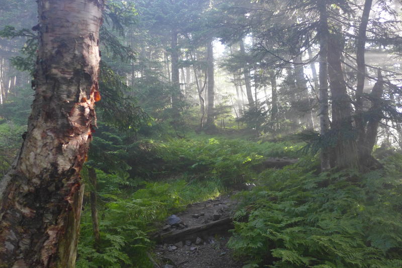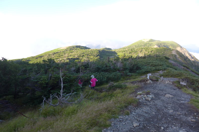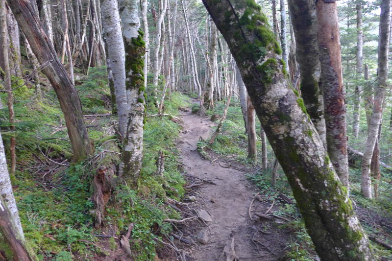朝目が覚めて空を見ると曇るところがなく星がキラキラと輝いている。ではもう一寝入りと小一時間寝て起きると、ガスで覆われている星空はどこへ行ってしまったのか。それでも雨に降られるとの予報ではなかった。テントを畳むころには半数の人が出発してしまった。テント場の朝は早い。静高平の水場で水をいただいたあとは一直線で易老岳まで進む。小休止したのち希望峰へ進むと20数人のツアー登山に道を譲ることになる。その後ダケカンバの稜線を歩いていると喧しい集団がやってくる。そのうるささは特筆もので、こちらが道を譲って待っているときもぺちゃくちゃ。なんとかツーリズムのツアー登山だった。